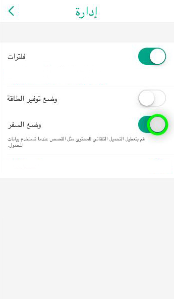 يمكنك تفعيل هذه الخاصيّة من خلال هذه الخطوات، من الشّاشة الرئيسيّة للتطبيق اضغط على أيقونة الاعدادت في الزّاوية اليمين في الأعلى، بعد ذلك اضغط على إدارة المفضّلات بقسم الخدمات الإضافيّة، بعد ذلك قم بتفعيل وضعيّة السفر.