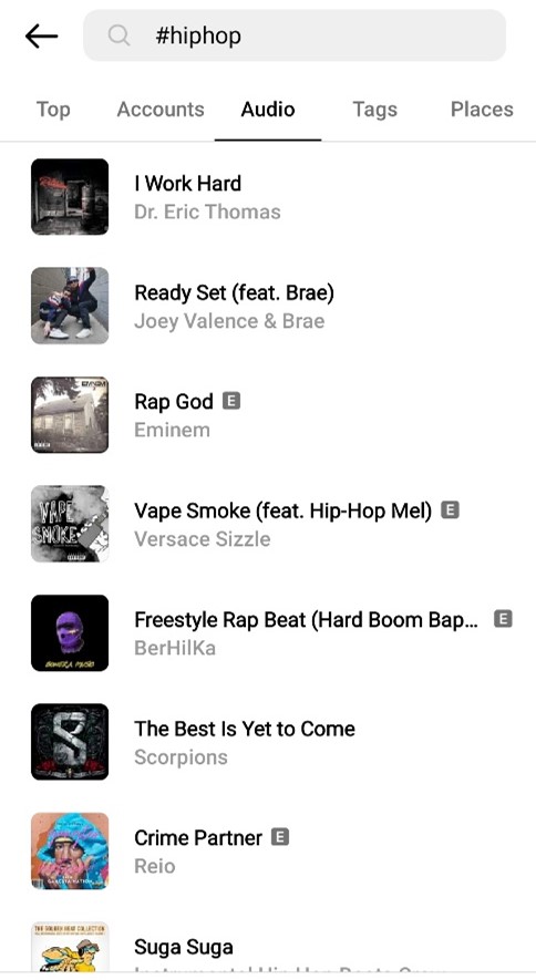 أحد الطرق التي ستساعدك في إيجاد مقاطع صوتية رائجة هو باستخدام الهاش تاغ للبحث عن المقاطع الصوتية من نوع الموسيقى التي ترغب بها أو تبحث عنها، فعلى سبيل المثال إذا كنتَ تبحث عن مقطع صوتي من نوع موسيقى الـ هيب هوب، فستبحث عن #hiphop أو #rap أو #trending.